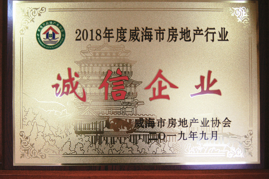 獲獎名稱:2018年度威海市房地產行業誠信企業 獲獎單位:威海市房地產協會 頒發單位:威海市房地產業協會