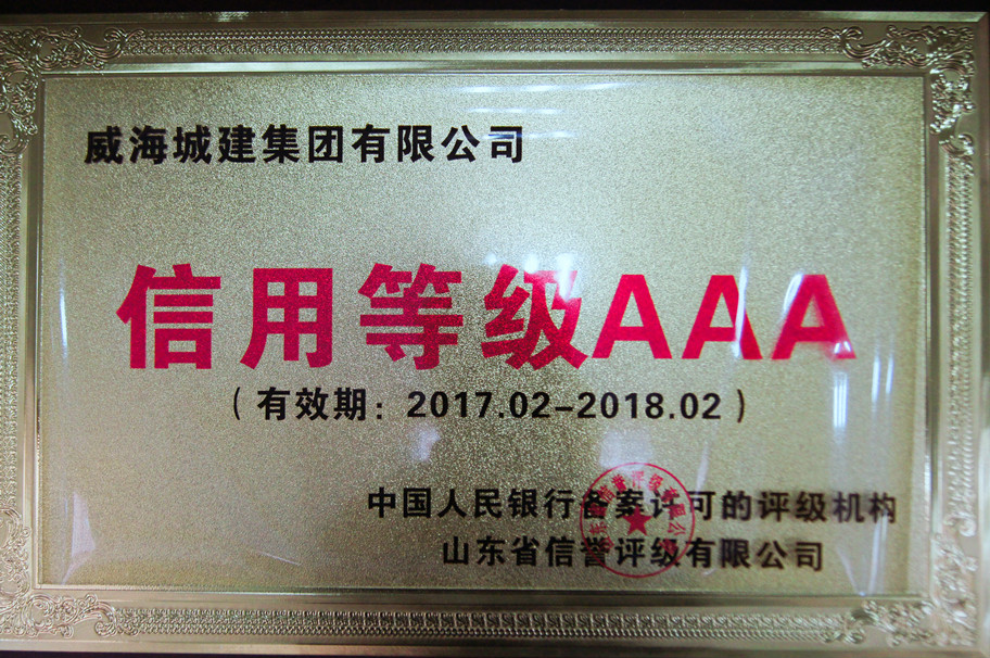 證書名稱:信用等級AAA企業 獲證單位:威海城建集團有限公司 發證單位:山東省信譽評級有限公司
