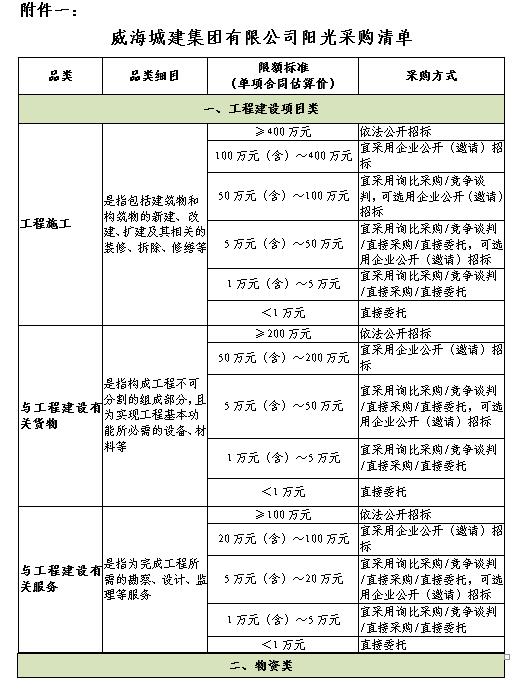 第十七條 本制度規定的采購范圍包括工程建設項目、物資和社會服務的招標采購(詳見附件一《威海城建集團有限公司陽光采購清單》)。