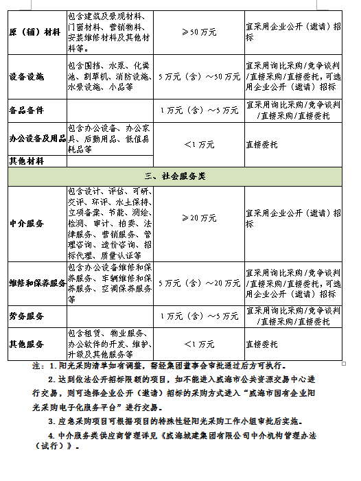 第十九條 工程建設項目類、物資類50萬元以上、社會服務類20萬元以上且委托招標代理采購與招標項目,原則上應按照相關程序進入威海市國有企業陽光采購電子化服務平臺進行交易,不進入平臺交易的項目應當經陽光采購工作小組審批通過后執行;其他項目可積極進入威海市國有企業陽光采購電子化服務平臺進行交易。
