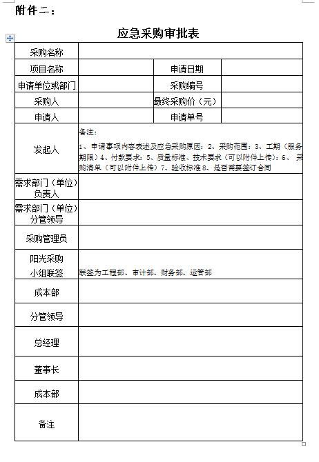 2.工作流程:需求部門(單位)提報《采購申請表》,按規定程序審批通過后,由成本部委托招標代理機構具體實施。