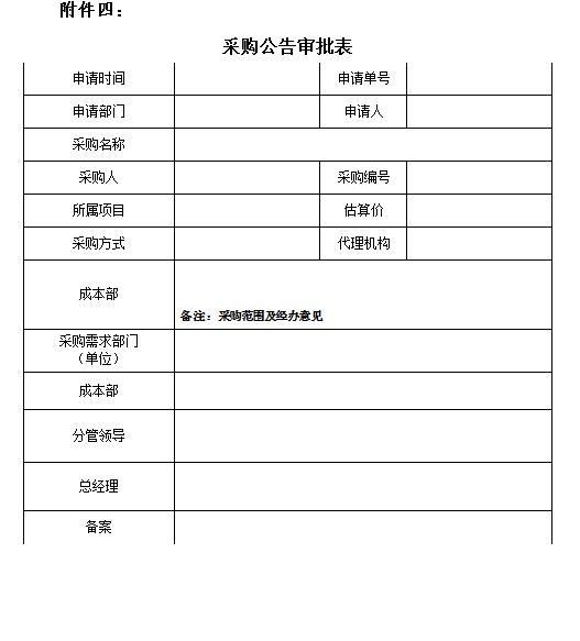 3.工作流程:需求部門(單位)提報《采購申請表》,按規定程序審批通過后,由成本部委托招標代理機構具體實施。